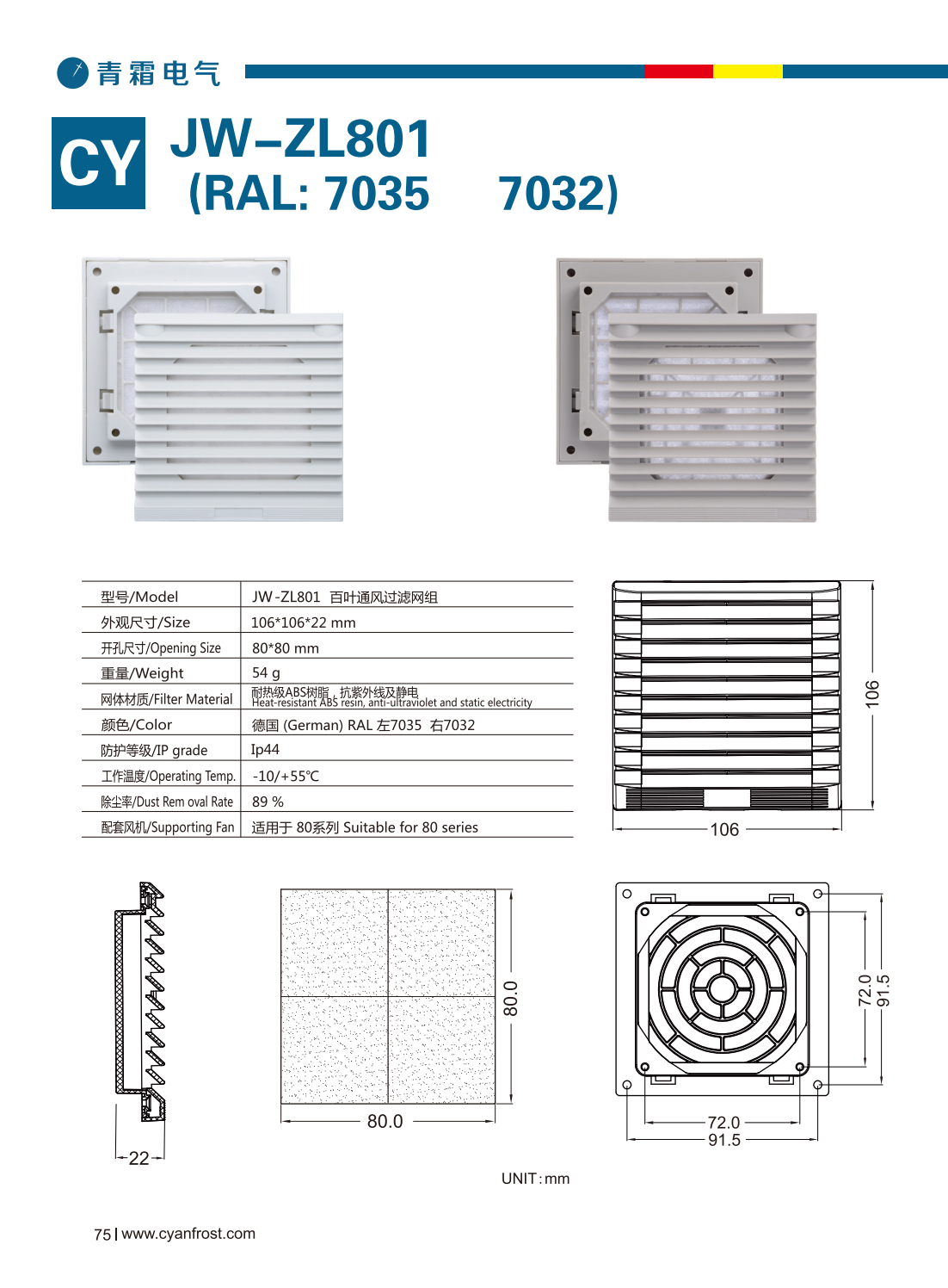型号: JW - ZL801 外观尺寸: 106*106*22mm 开孔尺寸: 80*80mm 重 量: 54 g 网体材质: 耐热级ABS树脂,抗紫外线及静电 颜色: 左7035右7032 防护等级: Ip44 工作温度: -10/+55℃ 除尘率: 89 % 配套风机: 适用于80系列