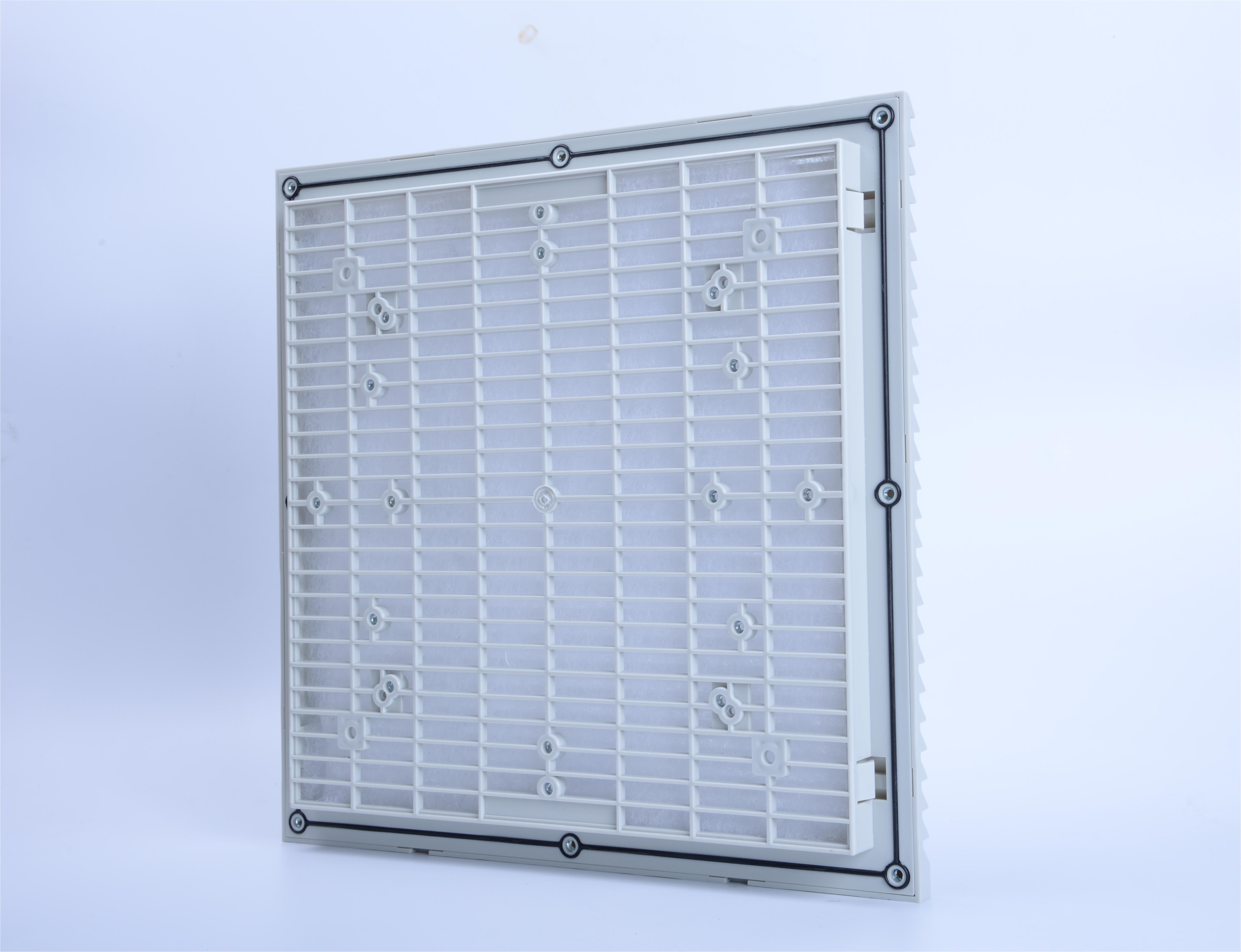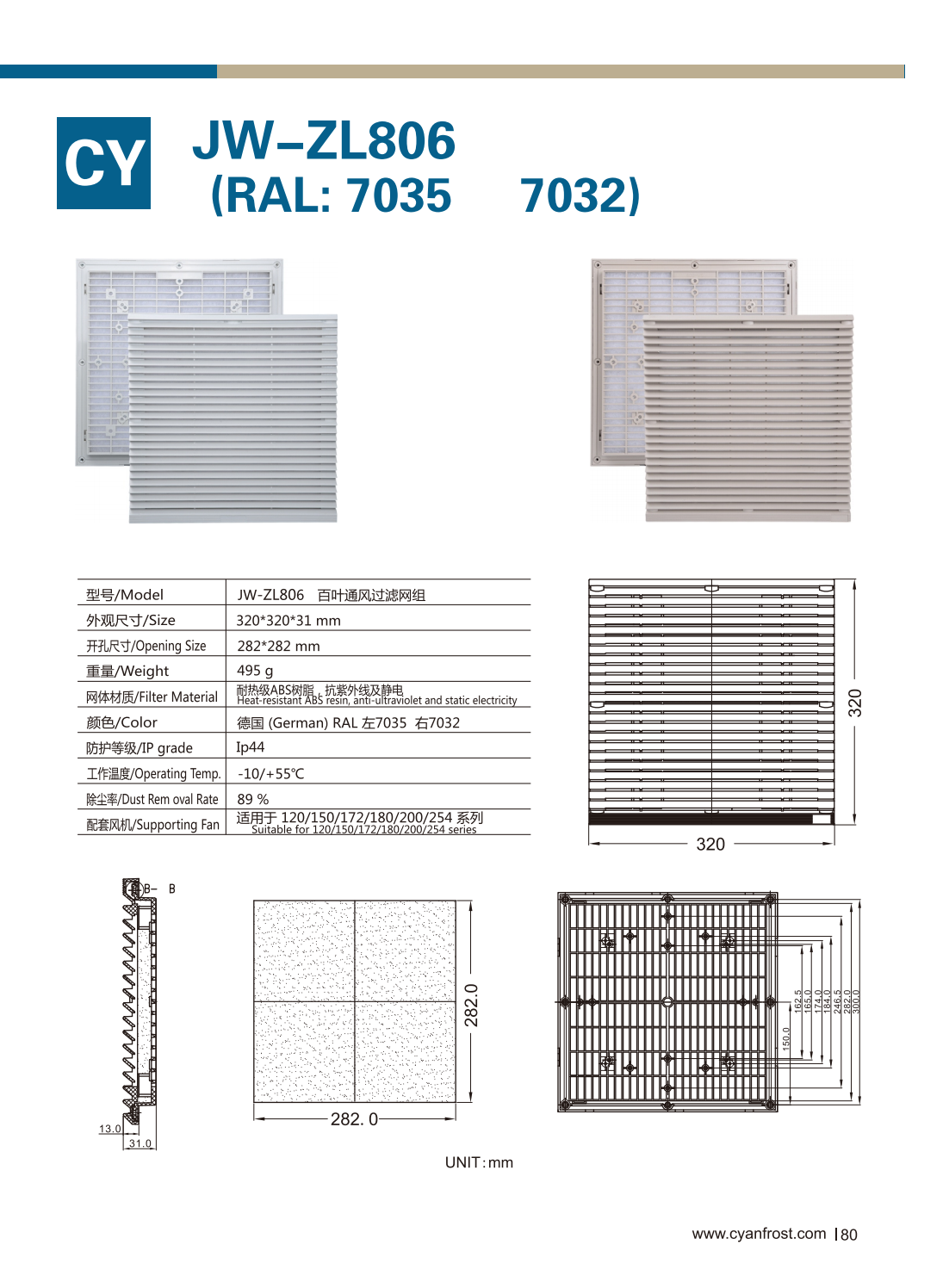型号: JW - ZL805 外观尺寸: 320*320*31mm 开孔尺寸: 282*282mm 重 量: 495g 网体材质: 耐热级ABS树脂,抗紫外线及静电 颜色: 左7035右7032 防护等级: Ip44 工作温度: -10/+55℃ 除尘率: 89 % 配套风机: 适用于120/150/172/180/200/254系列