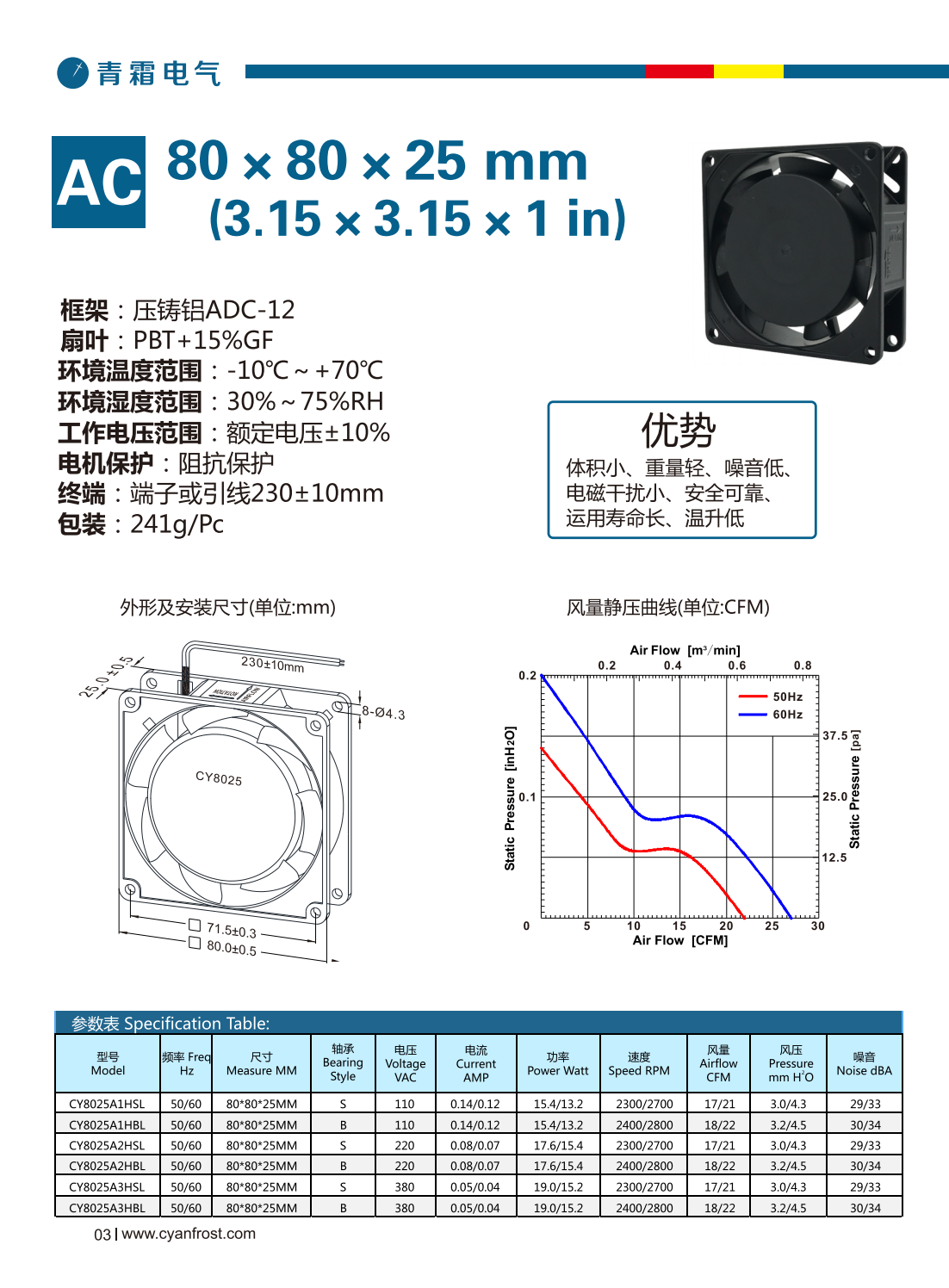 框架:压铸铝ADC-12 扇 叶 :PBT+15%GF 环境温度范围:-10℃~+70℃ 环境湿度范围:30%~75% RH 工作电压范围:额定电压±10% 电机保护:阻抗保护 终端:端子或引线230±10mm 包装:241g/Pc