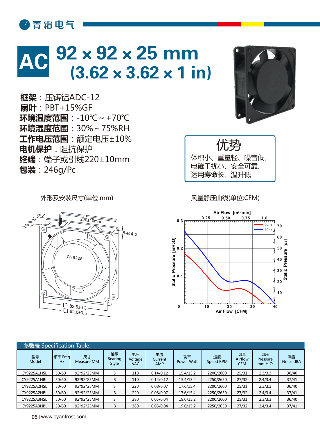 框架:压铸铝ADC-12 扇 叶 :PBT+15%GF 环境温度范围:-10℃~+70℃ 环境湿度范围 :30%~75% RH 工作电压范围:额定电压±10% 电机保护:阻抗保护 终端:端子或引线220±10mm 包装:246 g/Pc