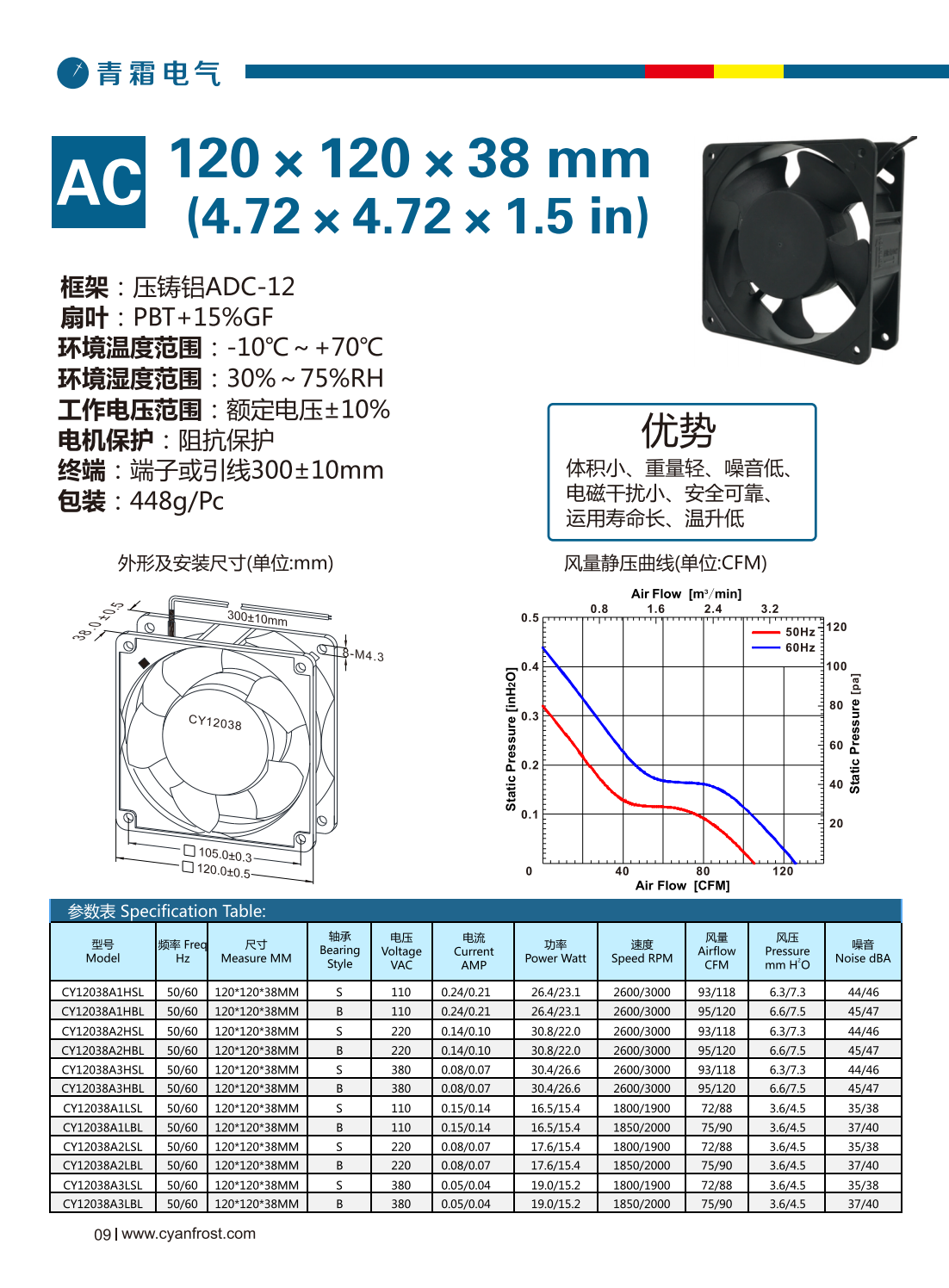 框架:压铸铝ADC-12 扇 叶:PBT+15%GF 环境温度范围:-10℃~+70℃ 环境湿度范围:30%~75% RH 工作电压范围:额定电压±10% 电机保护:阻抗保护 终端:端子或引线300±10mm 包装:448g/Pc