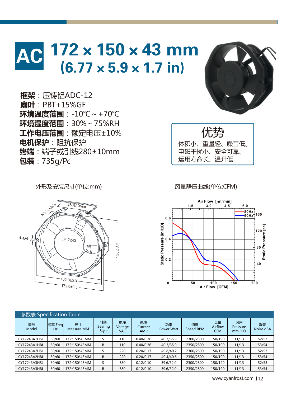 框架:压铸铝ADC-12 扇叶:PBT+15%GF 环境温度范围:-10℃~+70℃ 环境湿度范围:30%~75% RH 工作电压范围:额定电压±10% 电机保护:阻抗保护 终端:端子或引线280±10mm 包装:735g/Pc