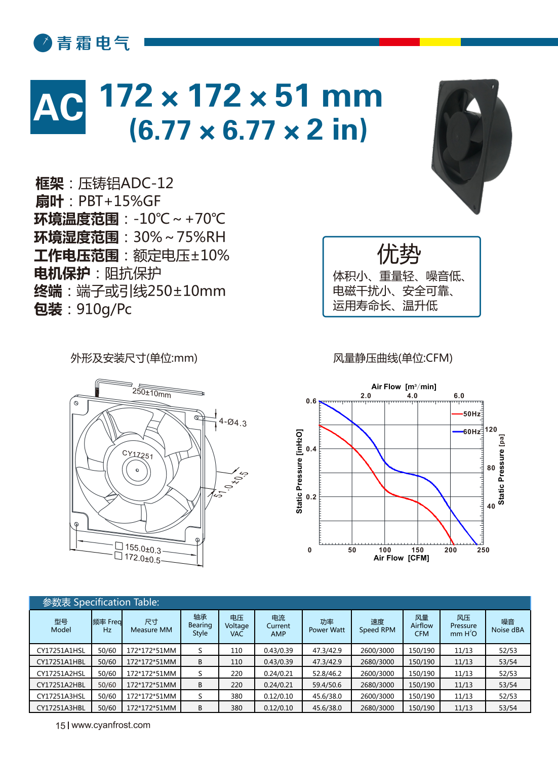 框架:压铸铝ADC-12 扇叶:PBT+15%GF 环境温度范围: -10℃~+70℃ 环境湿度范围:30%~75% RH 工作电压范围:额定电压±10% 电机保护:阻抗保护 终端:端子或引线250±10mm 包装:910g/Pc