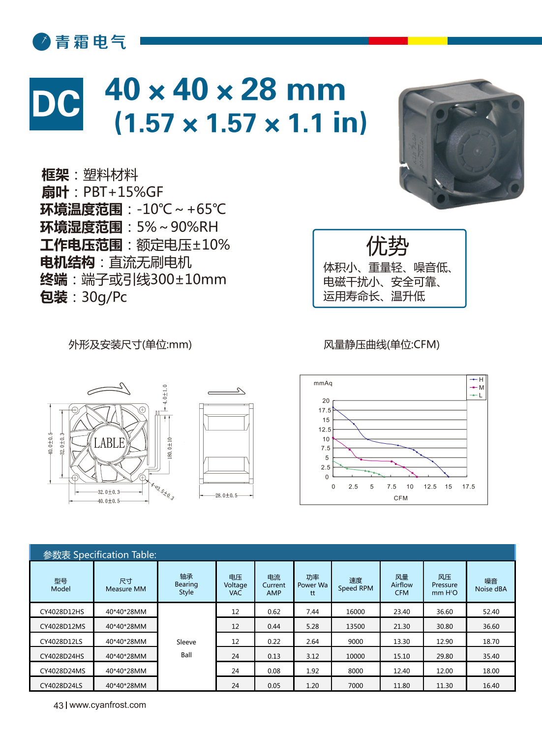 框架:塑料材料 扇叶:PBT+15%GF 环境温度范围:-10℃~+65℃ 环境湿度范围:5%~90% RH 工作电压范围:额定电压±10% 电机结构:直流无刷电机 终端 :端子或引线300±10mm 包装: 30 g/Pc