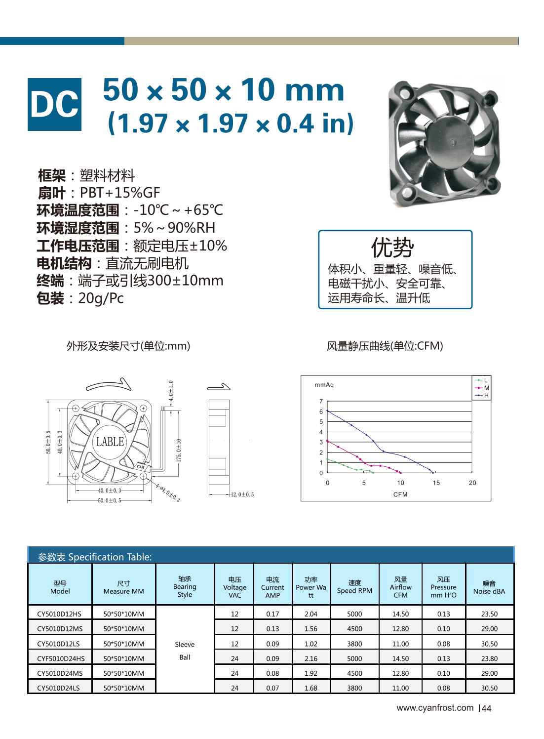 框架:塑料材料 扇叶:PBT+15%GF 环境温度范围:-10℃~+65℃ 环境湿度范围:5%~90% RH 工作电压范围:额定电压±10% 电机结构:直流无刷电机 终端:端子或引线300±10mm 包装:20g/Pc