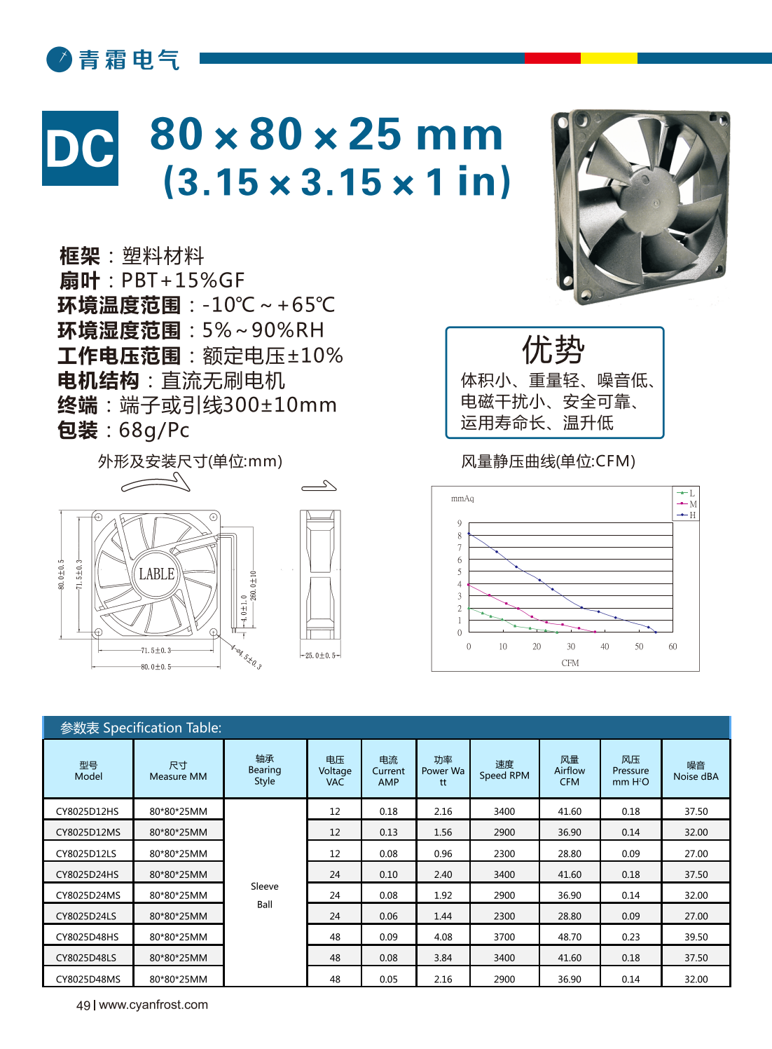 框架 :塑料材料 扇叶:PBT+15%GF 环境温度范围:-10℃~+65℃ 环境湿度范围:5%~90% RH 工作电压范围:额定电压±10% 电机结构 :直流无刷电机 终端:端子或引线300±10mm 包装 :68g/Pc