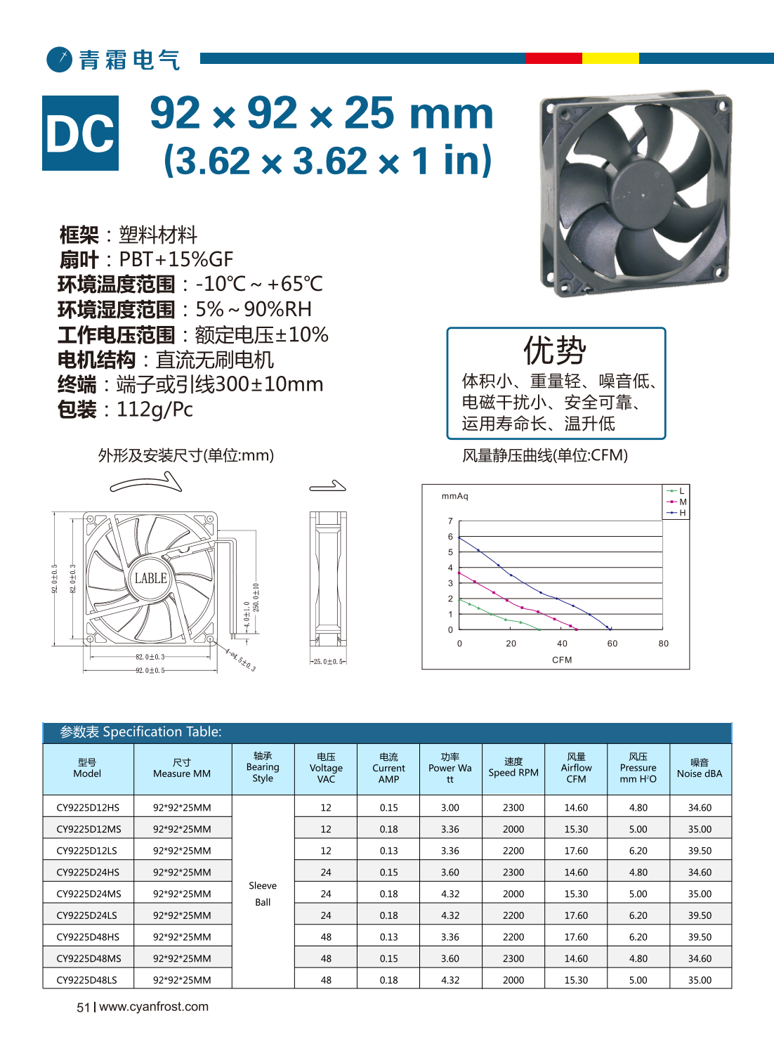 框 架 :塑料材料 扇 叶 :PBT+15%GF 环境温度范围:-10℃~+65℃ 环境湿度范围:5%~90% RH 工作电压范围:额定电压±10% 电机结构 :直流无刷电机 终端:端子或引线300±10mm 包装:112 g/Pc